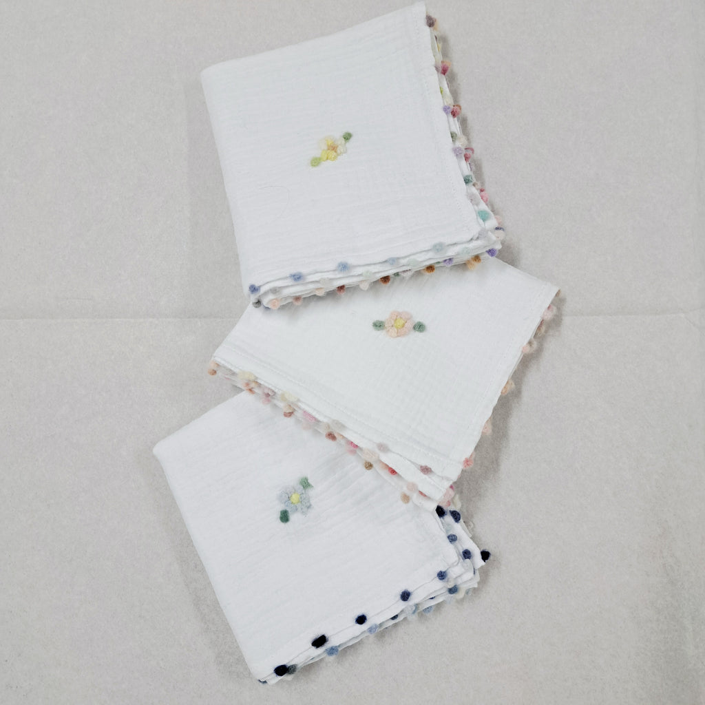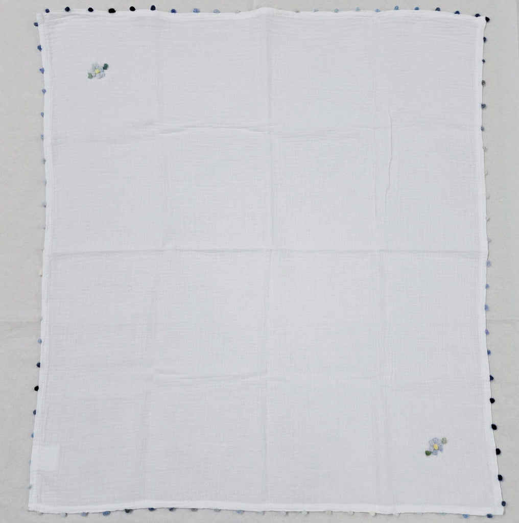 This unique cotton swaddle square makes a simply beautiful and original gift idea . The double weave cotton is so soft , it comes only in white . The edges are embroidered with my original cashmere dots and a flower is placed on alternate corners .