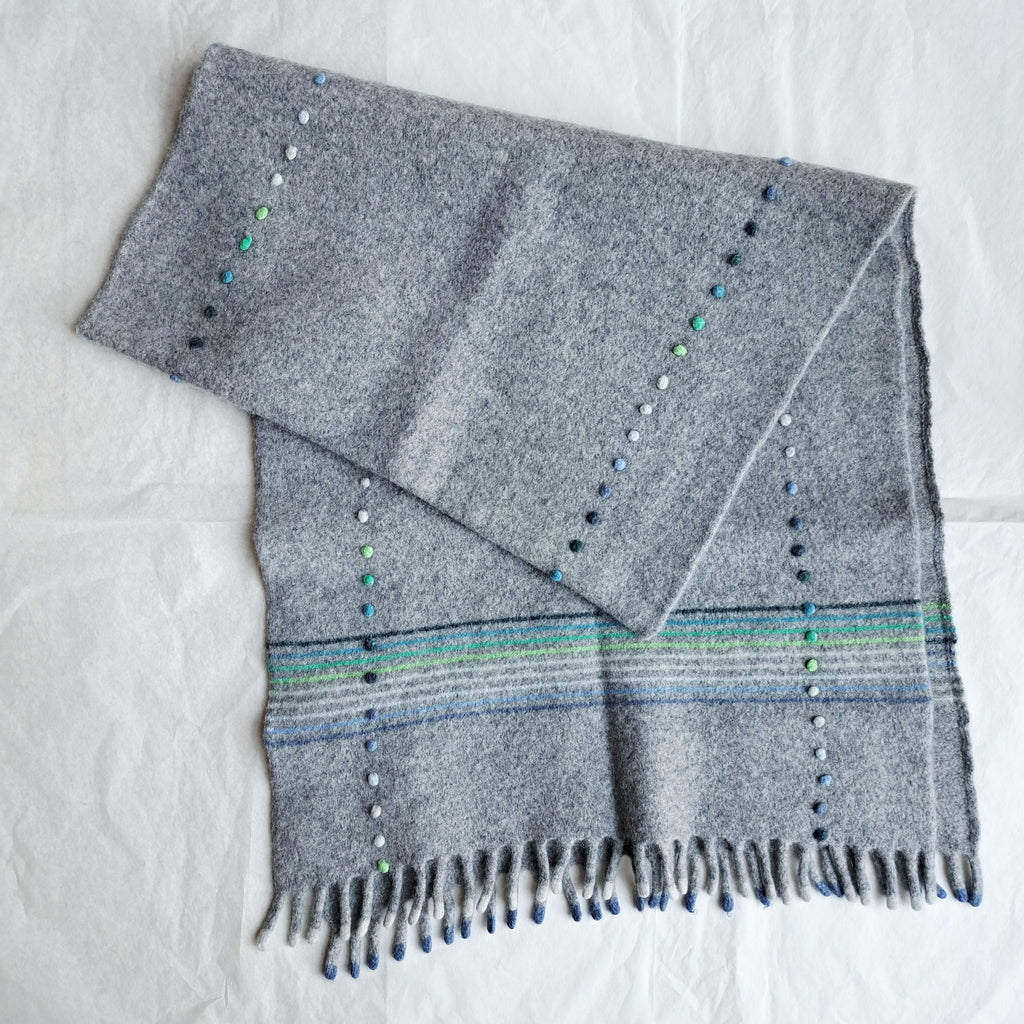 - Pure cashmere scarf , 1 ply , felted single jersey with placed stripe panel and two rows of cashmere 'dots' embroidery along both sides for the full length of the scarf .