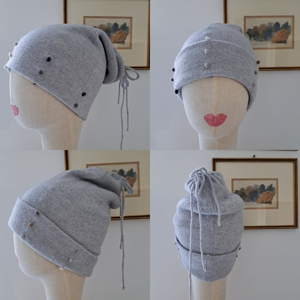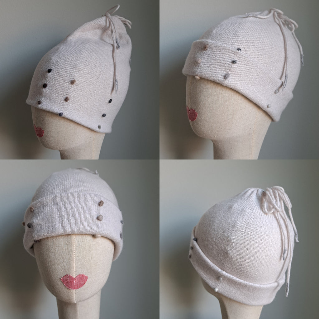 - 100% cashmere , 1 ply , handloomed , felted reversible beanie hat , with double drawstring top , embroidered with cashmere dots.