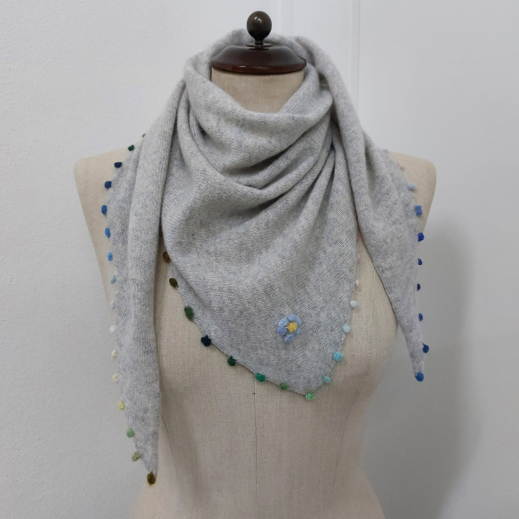 An oh-so-soft triangle scarf with dots embroidery along two edges , and a flower placed in the corner . Handloom knitted here in my workshop in Onno on Lake Como . One end of pure cashmere knitted in a single jersey stitch . Wear it like a bandana or like a foulard , any way it will be striking and special .