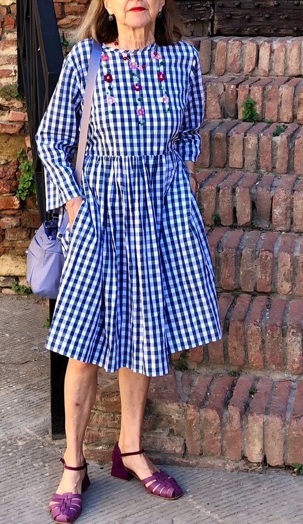 Questa è una nuova versione di questo delizioso vestito, facile da indossare, dalla vestibilità ampia e con scollatura rotonda profonda. Ora con maniche a 3/4. Ricamo floreale sul corpetto, sia davanti che dietro. Una gonna ampia con orlo profondo. Tasche nelle cuciture laterali e una cintura in nastro gros-grain larga 2,5 cm di colore a contrasto, che richiama il tono scuro del ricamo. La cintura può essere indossata in modo tradizionale o legata sul retro per dare una linea più snella al vestito.